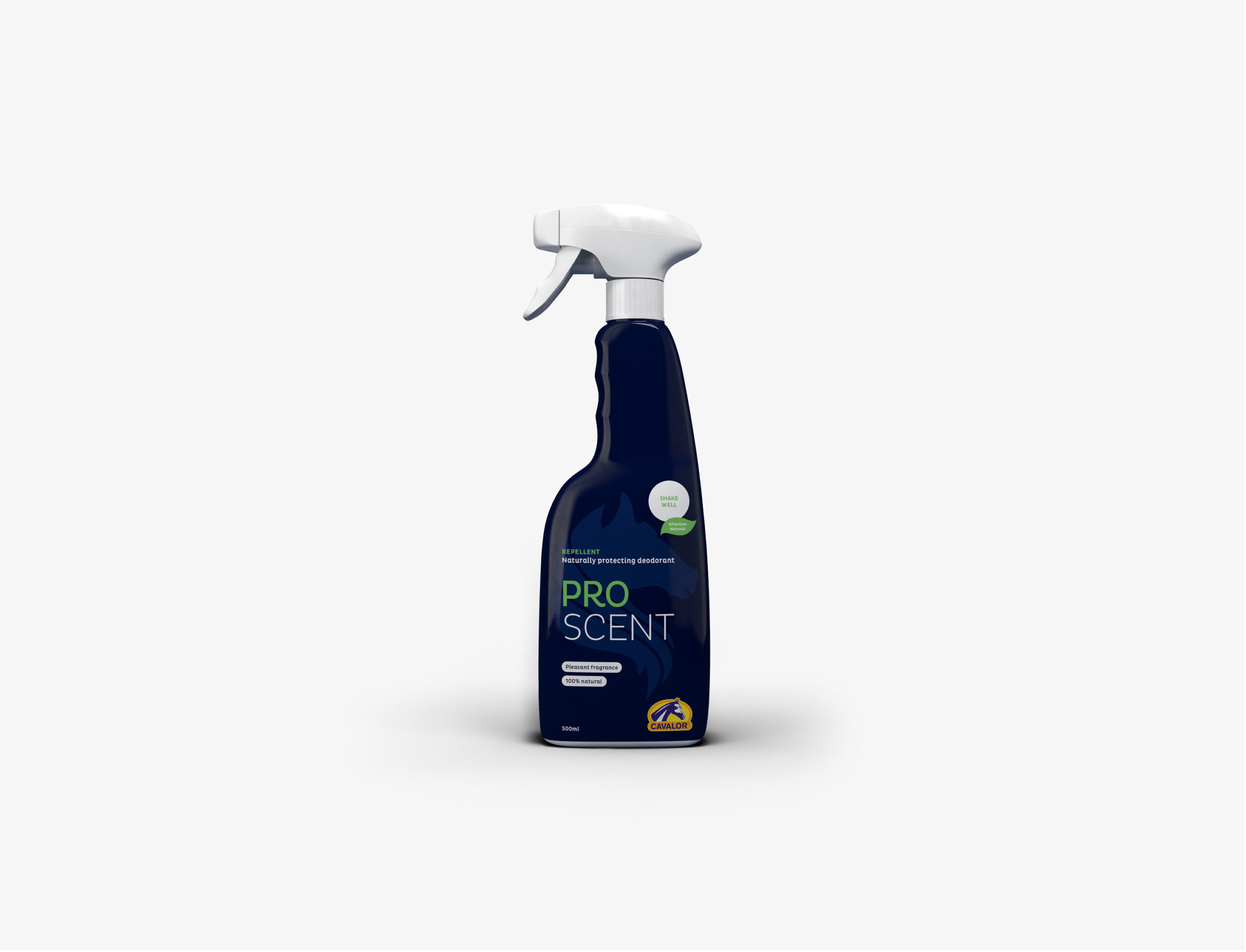 För ProScent användes en blandning av eteriska oljor, som inte bara imponerar med sin fräscha, örtiga doft, utan också neutraliserar hästens kroppslukt. De håller även hästens päls glänsande och frisk. Den naturligt effektiva pälssprayen är ideal för åkturer på sommaren!