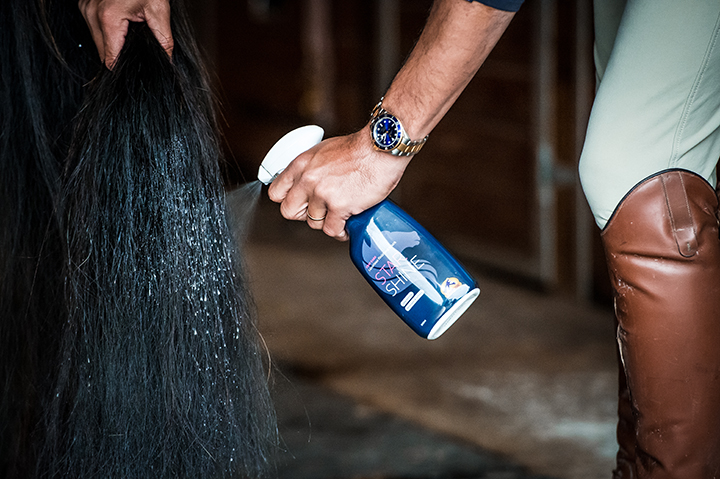 - Spraya Cavalor Star Shine på hästens torra eller våta man, svans och päls.