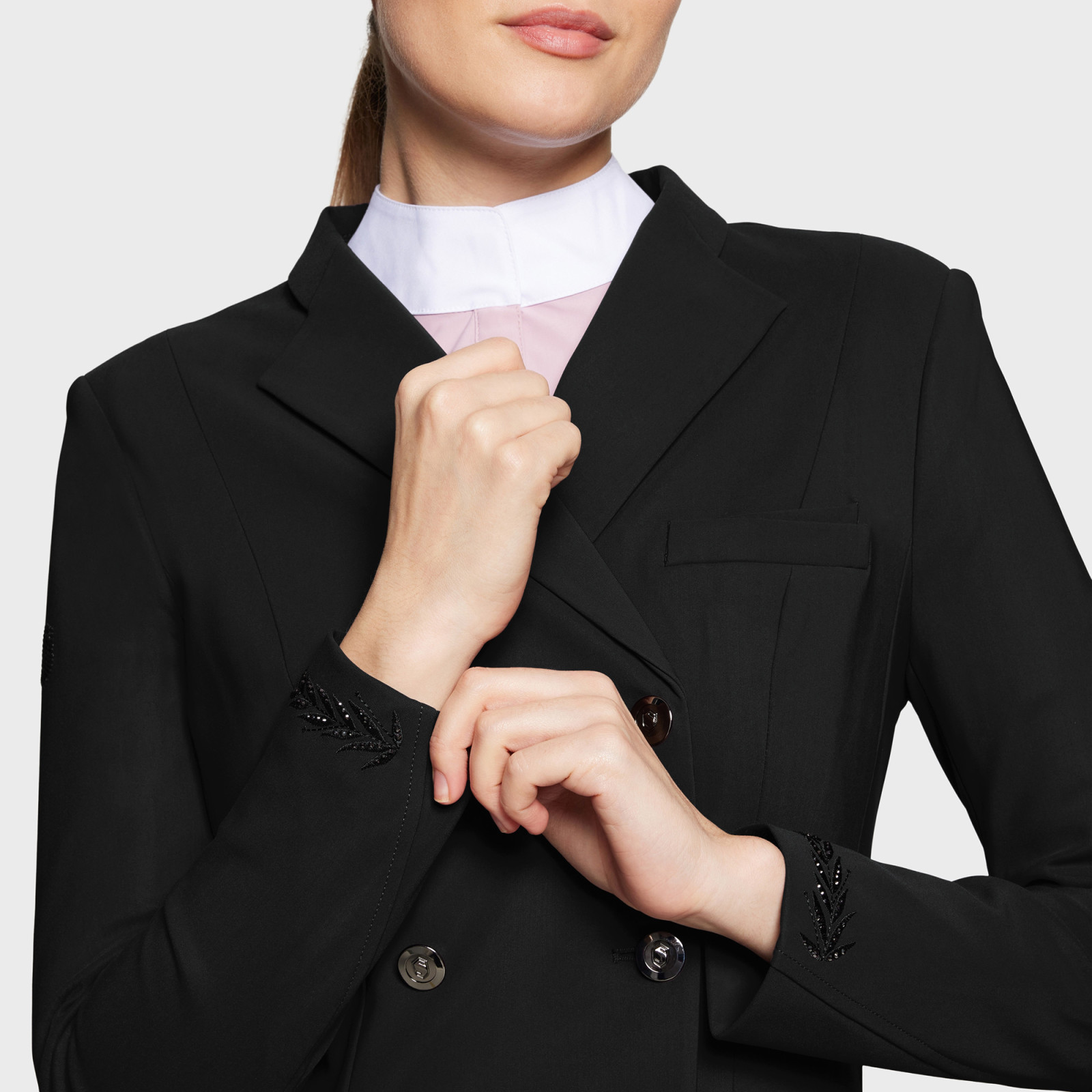 Blommigt broderi med Swarovski®-kristaller på ärmsluten och kragen